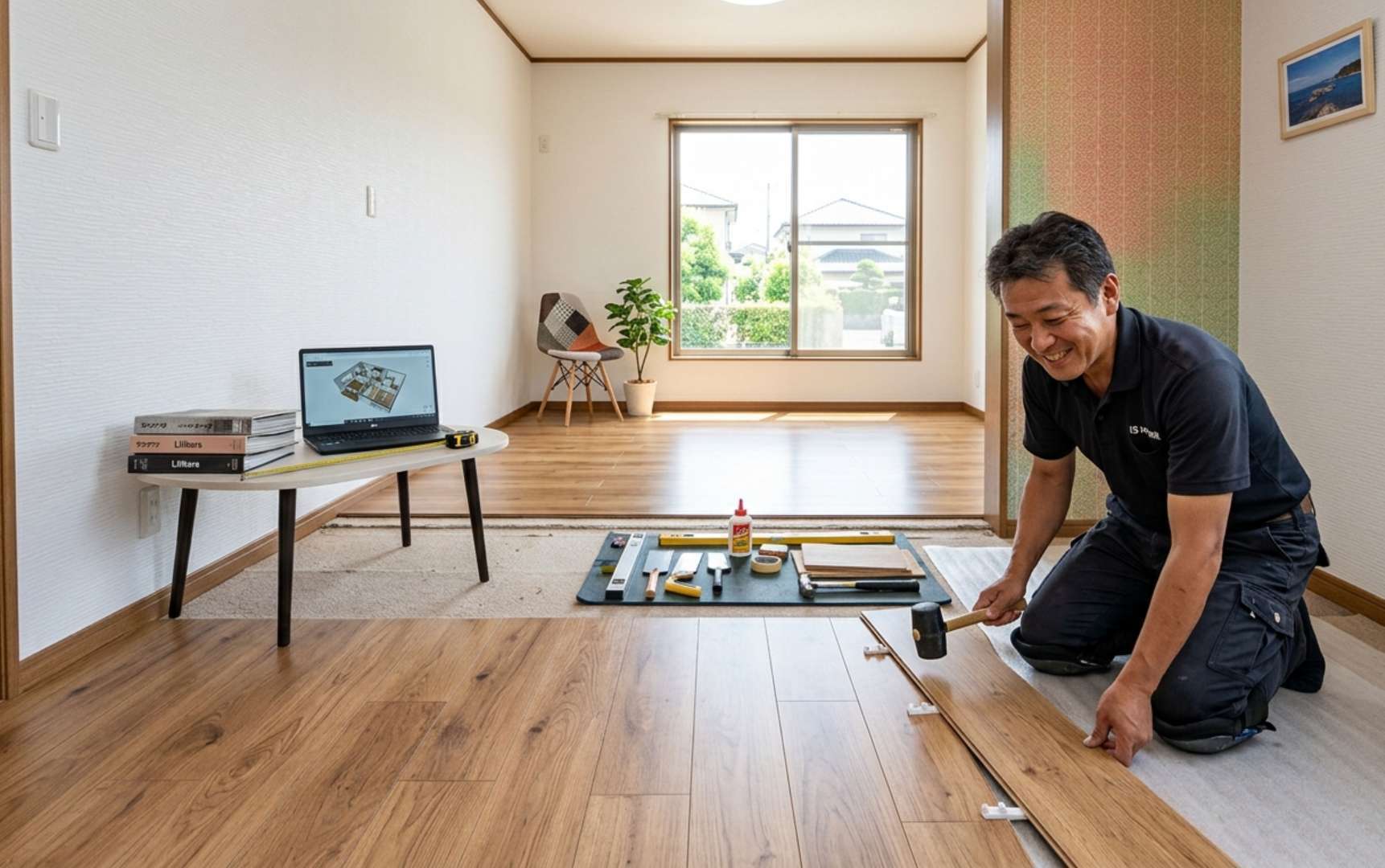 内装工事: 新しいフローリングを張り、壁と天井にクロスを貼ります。和室の雰囲気を残すなら、天井に木目調のクロスを選んだり、襖の代わりに和紙調のロールスクリーンを取り付けたりするのもおしゃれです。