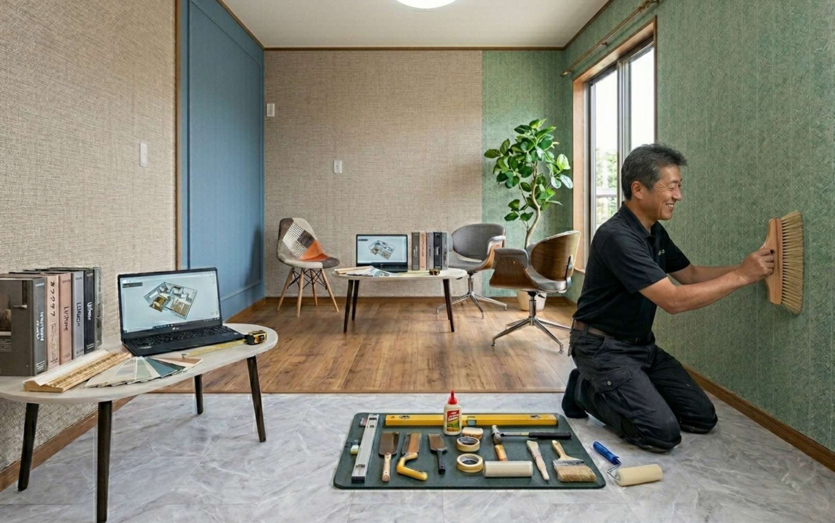 内装工事で最も不安なのは、「完成後のイメージが湧かない」ことではないでしょうか。「この壁紙を貼ったら、部屋が暗くならないか?」「この床の色と、手持ちの家具は合うか?」といった疑問は、平面図や小さなサンプルだけでは解消できません。